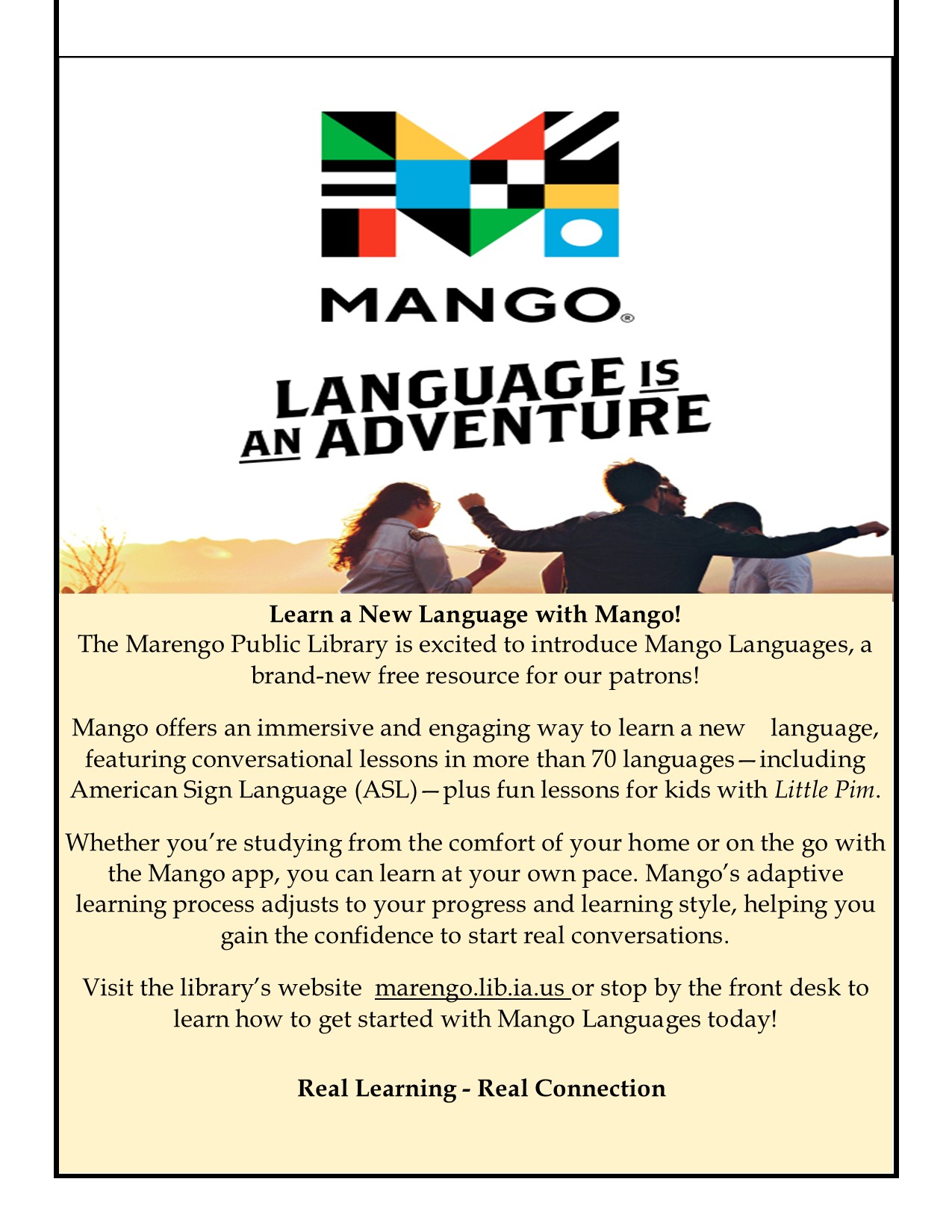 The Marengo Public Library provides equitable access to information and services to promote enlightened citizenship, enrich personal lives, and encourage lifelong learning to all members of the community.